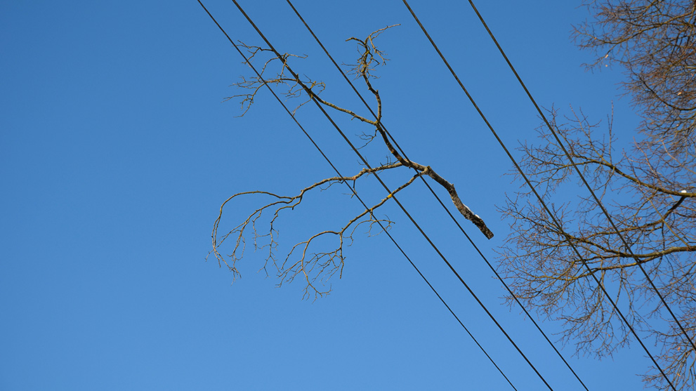 During a storm, falling trees or flying debris can damage lines or and poles, and in the winter, snow and ice can accumulate and weigh down lines and trees.