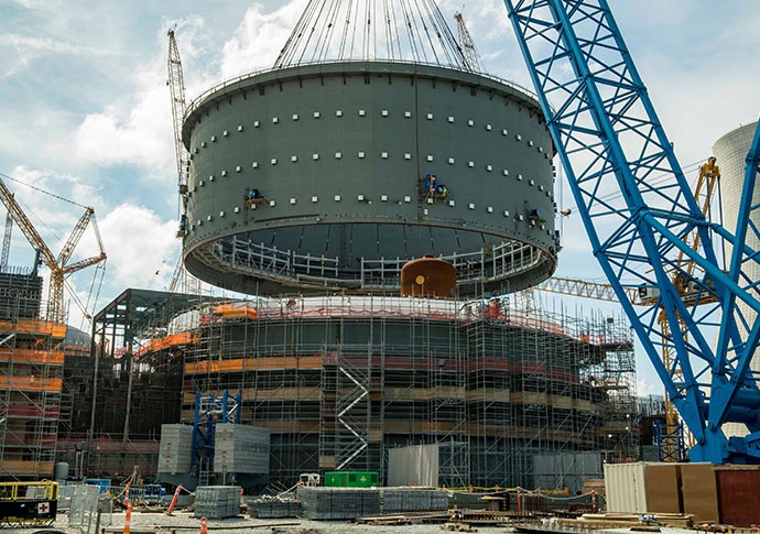 Weighing more than a jumbo jet, the 2.4 million-pound, 51-foot tall containment vessel ring consists of dozens of individual steel plates and was fabricated on site. The middle ring is the second of three containment vessel rings to be set for Unit 4.