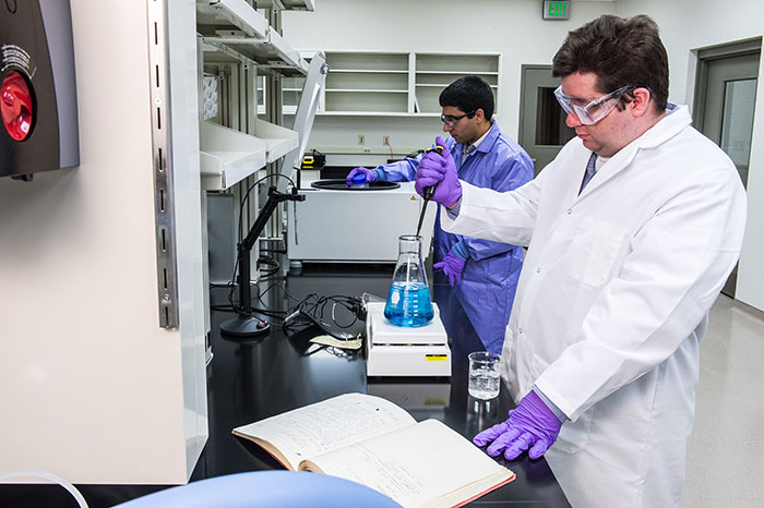Back: An engineer operates a centrifuge used for mixing another solution.