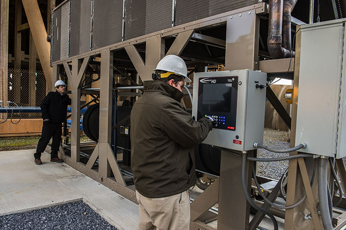 An engineer adjusts the controls on the Thermosyphon Pilot Unit.