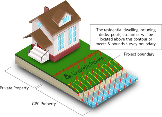 Private ownership down to the high-water mark – Georgia Power at minimum will maintain Project Boundary rights, regardless of lake and may have flood rights or a flood easement on the private-owned lot, which allows us to potentially limit or restrict structures in these areas. If the lot has structures in the lake or you desire to build structures in the lake, a proper legal agreement with Georgia Power is required.