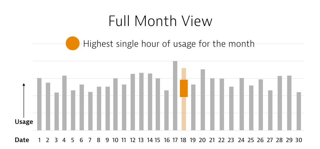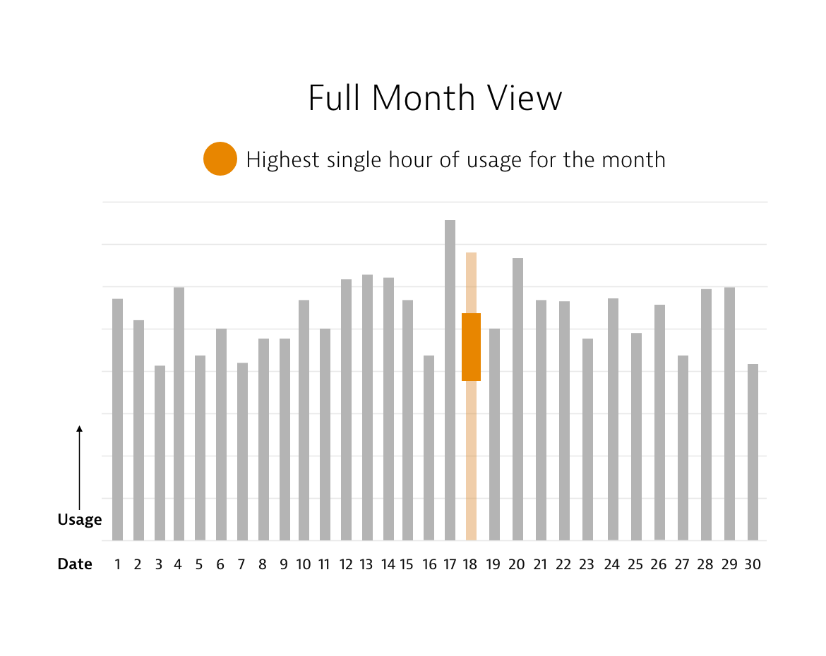 In the example below, the single hour with the most energy used for the full month was between 4 p.m. - 5 p.m. on the 18th.