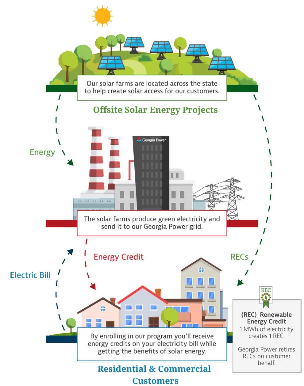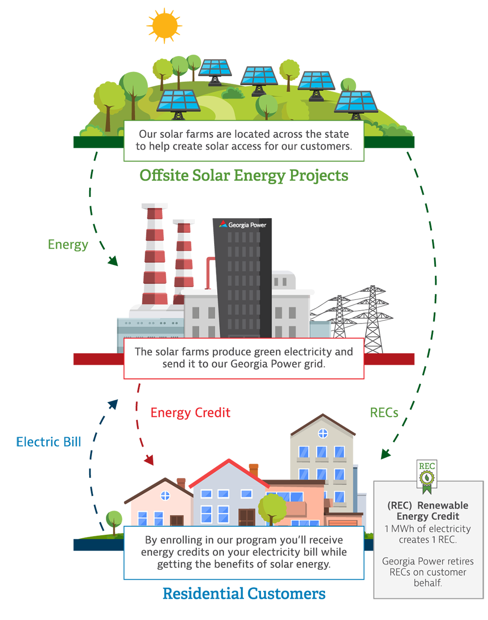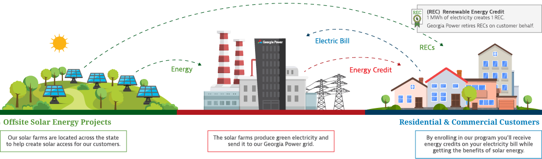 Your Georgia Power bill will include a line item showing your monthly subscription fee and your pro-rata share of the farms' solar generation (in kWh) during the month, which will offset your electric consumption based on your number of Community Solar subscription blocks. Please note that your bill will still include charges for your remaining monthly energy usage, according to your existing rate, including any applicable taxes, franchise fees or environmental costs.